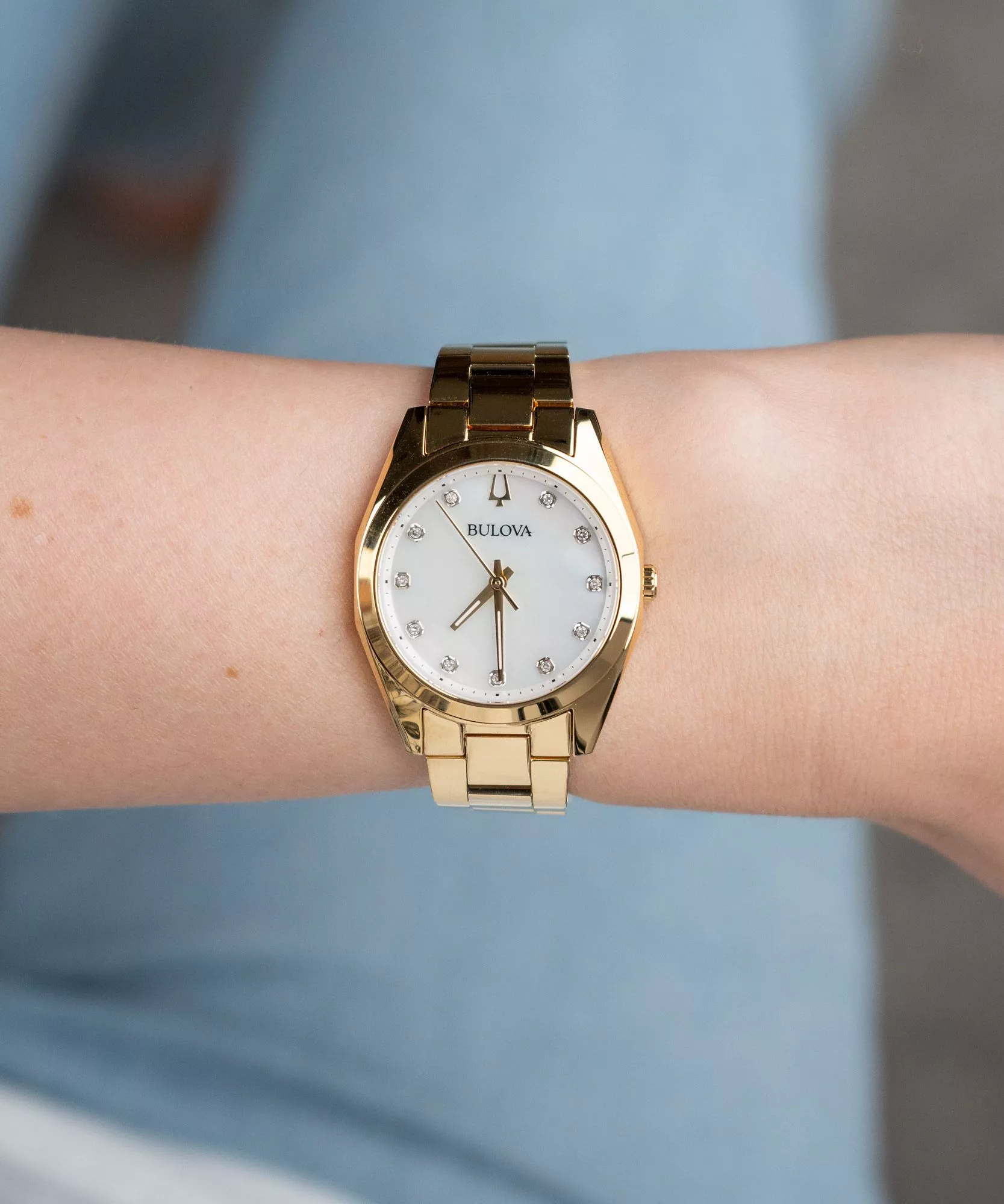 Ženski sat Bulova Surveyor Diamond 97P172 odiše luksuzom i sofisticiranošću, kombinirajući zlatni ton kućišta s prepoznatljivom bisernom podlogom brojčanika i dijamantnim indeksima. Svaka dama koja nosi ovaj model ističe svoj stil i samopouzdanje kroz diskretnu, ali upečatljivu estetiku. Ovaj sat dolazi iz prestižne kolekcije Surveyor Diamond – serije koja spaja preciznost, luksuz i izdržljivost u savršenom skladu.