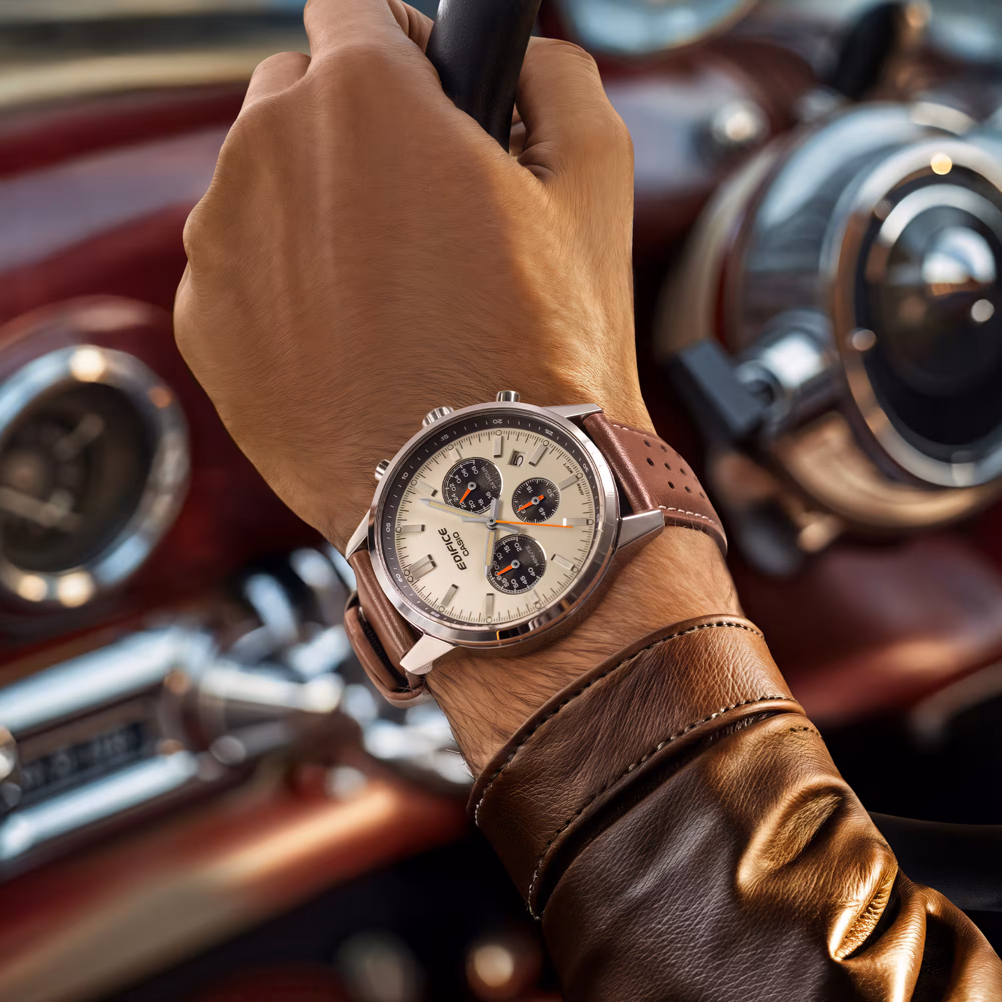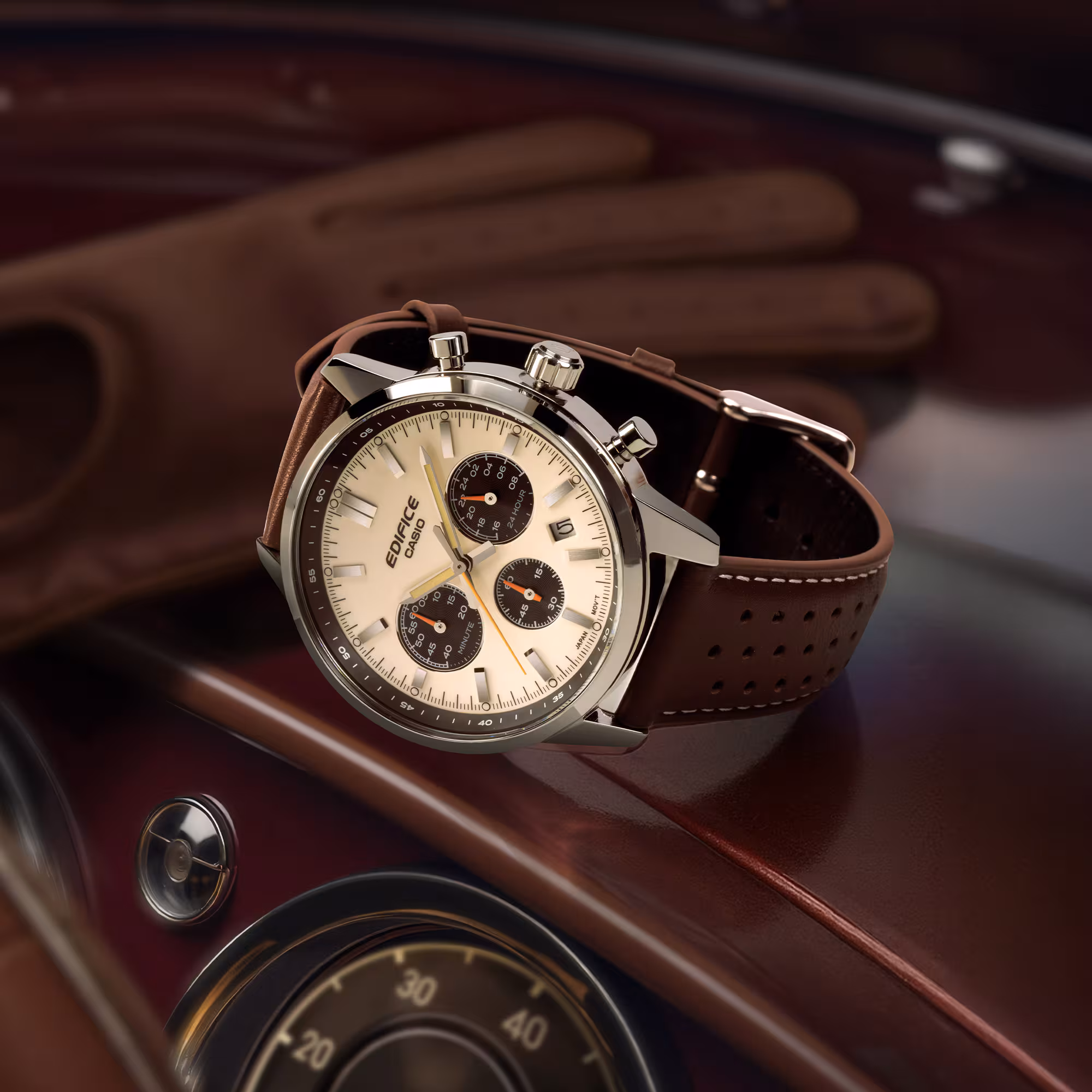 Casio Edifice EFR-575L-7AEF je sat koji kombinuje sportski karakter i elegantan retro stil. Krema brojčanik sa kontrastnim crnim podbrojčanicima i narandžastim detaljima daje izrazito atraktivan izgled, inspirsan instrument tablama sportskih automobila. Smeđa perforirana kožna narukvica dodatno naglašava vintage sportski karakter i udobna je za svakodnevno nošenje.