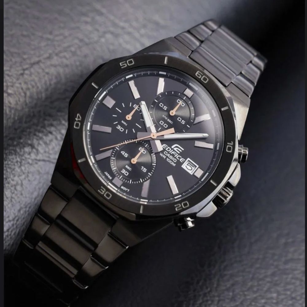 Casio EFV-640DC-1A je muški sat iz Edifice serije, poznate po praktičnim funkcijama i modernom sportskom dizajnu. Kućište i narukvica su izrađeni od nehrđajućeg čelika u crnoj boji, što sat čini elegantnim i pogodnim za svakodnevno nošenje. Crni brojčanik s hronograf podsatovima i diskretnim narandžastim detaljima omogućava jasan prikaz vremena, a mineralno staklo pruža dobru zaštitu od ogrebotina.