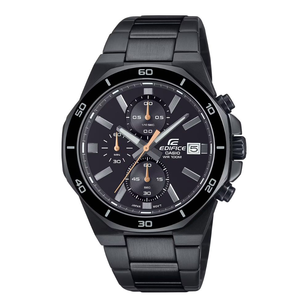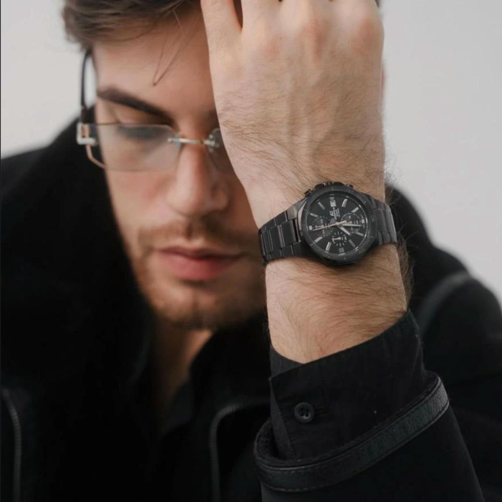 Crni “full black” dizajn sa narandžastim linijama daje modelu sportski karakter i čini ga popularnim izborom među Edifice kupcima.