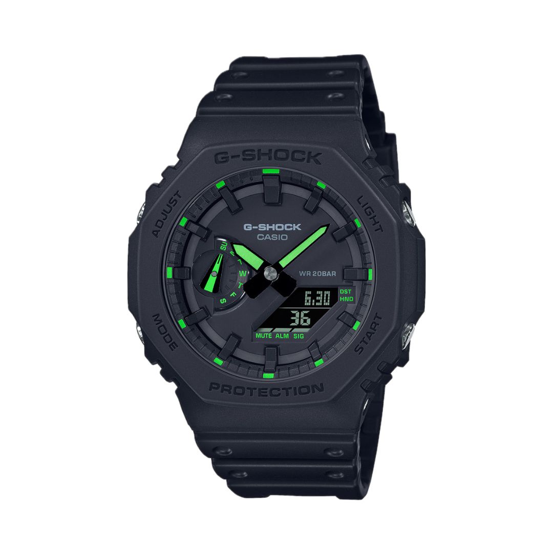 Casio GA-2100-1A3ER je model iz G-Shock 2100 serije koji spaja analogni i digitalni dizajn u slatkom „mixed“ stilu. Kućište i bezel izrađeni su od karbonski ojačane smole (Carbon Core Guard), što ga čini laganim, ali vrlo otpornim. Brojčanik je mat crn s naglašenim neonsko zelenim detaljima, pružajući moderan i privlačan izgled. Kazaljke i indeksi imaju luminiscentni premaz koji omogućava čitanje i u slabo osvijetljenim uvjetima.