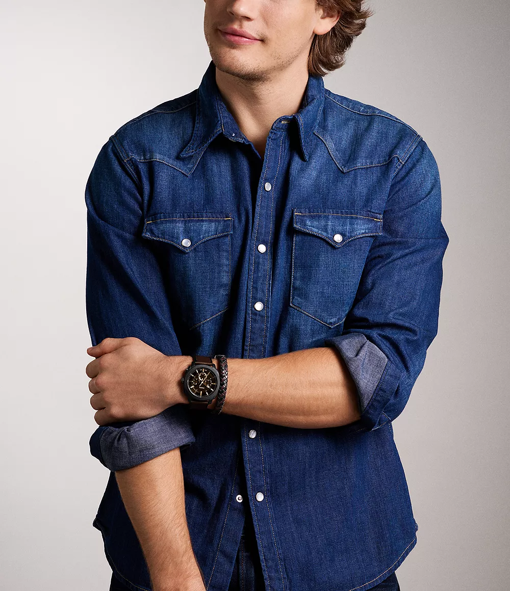 Ultimativni muški set: Fossil Machine sat industrijskog dizajna + kožna narukvica. Robusan stil za svakodnevno nošenje.