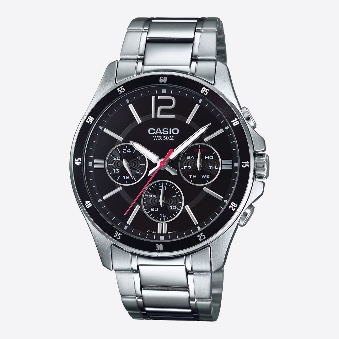 CASIO MTP-1374D-1AVDF je elegantan muški sat koji spaja sofisticiran izgled i funkcionalnost. Sa svojim crnim brojčanikom, hronografskim podbrojčanicima i čeličnom narukvicom, ovaj model odražava pouzdanost i stil koji se uklapa u svaku priliku – od poslovne do svakodnevne.