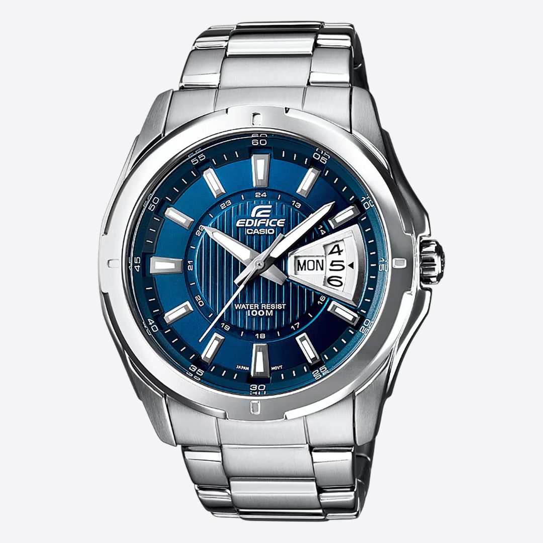 CASIO EDIFICE EF-129D-2AVEF donosi savršenu kombinaciju sportskog duha, elegancije i funkcionalnosti. Njegov upečatljivi plavi brojčanik s metalnim odsjajem i masivno kućište od nehrđajućeg čelika čine ga jednim od najtraženijih modela iz Edifice kolekcije. Dizajniran je za muškarce koji žele preciznost, pouzdanost i prepoznatljiv stil u jednom satu.