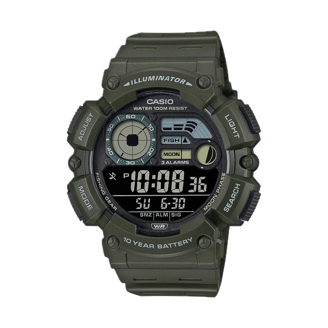 Casio WS-1500H-3BVEF je digitalni sat dizajniran za ljude koji vole aktivnosti na otvorenom. Kombinuje moderan izgled sa praktičnim funkcijama poput moon phase indikatora, fish / fishing moda i LED osvjetljenja, što ga čini idealnim za ribolov, kampovanje, planinarenje i svakodnevno korištenje. Kućište i remen su od smole (resin), lagani ali izdržljivi, a ekran je velik i pregledan.
