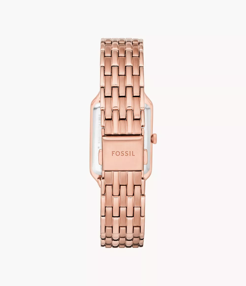 Rose Gold klasika: Raquel model pravougaonog oblika. Bijeli ciferblat sa rimskim brojevima i datumom.