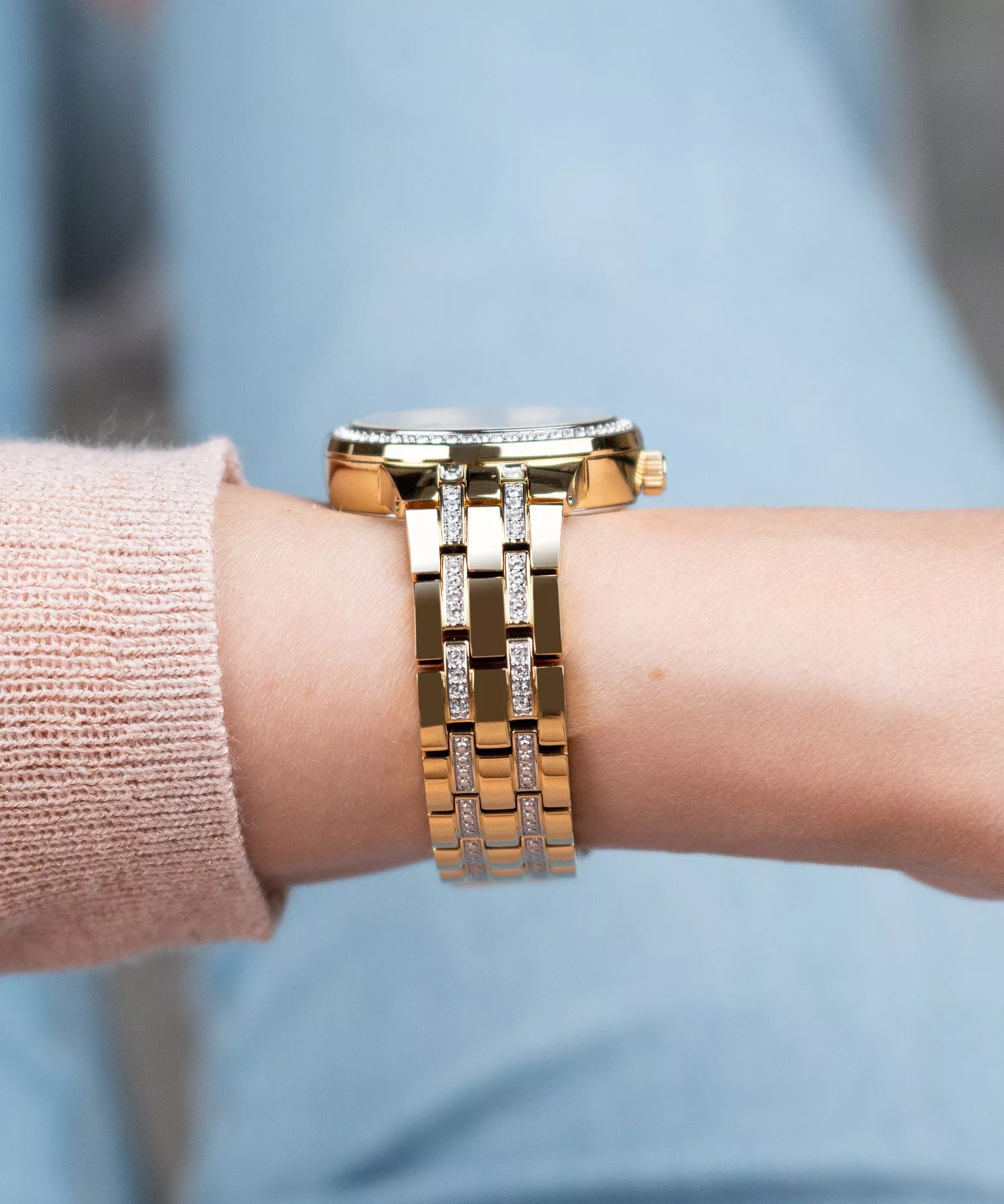 Luksuzni dizajn u potpunosti u zlatnoj boji s ukrasnim kristalima na kućištu i narukvici.