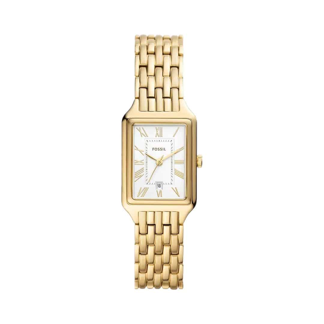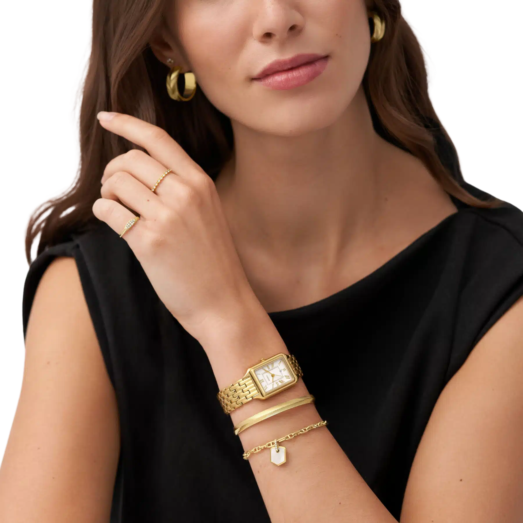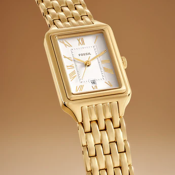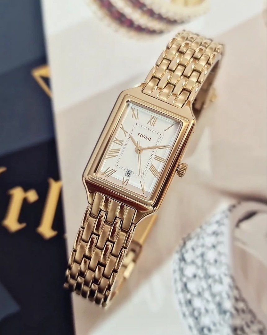 Fossil ES5220 iz kolekcije Raquel je suptilan i sofisticiran ženski sat sa pravougaonim kućištem zlatne boje i srebrnim brojčanikom. Dizajniran je tako da izgleda profinjeno, a da ipak bude svakodnevno nosiv. Ovo je sat koji kombinuje klasične forme s modernim detaljima – idealan za dame koje žele da se izdvoje, ali ne pretjeruju.