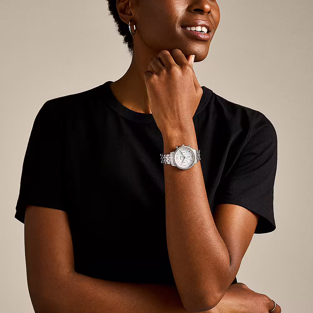 Fossil ES5357 iz Neutra kolekcije kombinuje klasičan dizajn s modernim detaljima. Sat ima kućište promjera 36 mm i čeličnu narukvicu u srebrnoj boji. Na brojčaniku se nalazi bijeli mother-of-pearl efekt i tri podbrojčanika hronografa. Stil je elegantan i proporcionalan, a sat je prikladan za svakodnevno nošenje i razne prilike.