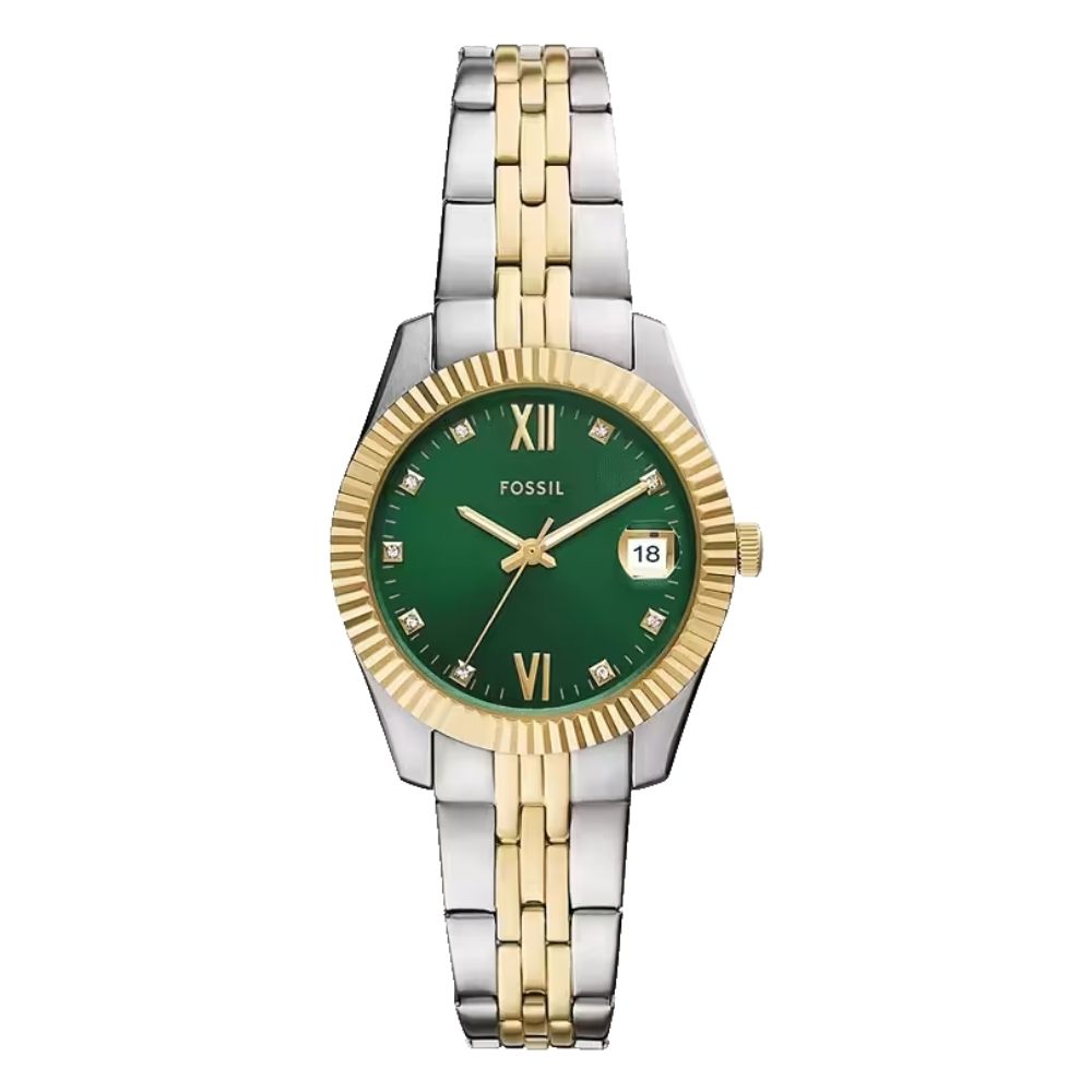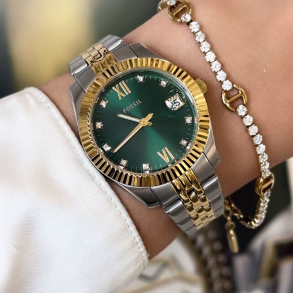 Ženski Sat Fossil ES5388 je ženski sat iz kolekcije Scarlette koji spaja zelen i zlatne tonove. Posjeduje kućište prečnika 33 mm od nehrđajućeg čelika srebrene boje, sa zelenim sunčanim brojčanikom. Narukvica je dvobojna, kombinacija srebrene i zlatne boje, izrađena od nehrđajućeg čelika, što doprinosi elegantnom izgledu. Otpornost na vodu je do 5 ATM, što ga čini pogodnim za svakodnevnu upotrebu, uključujući prskanje vodom i tuširanje.