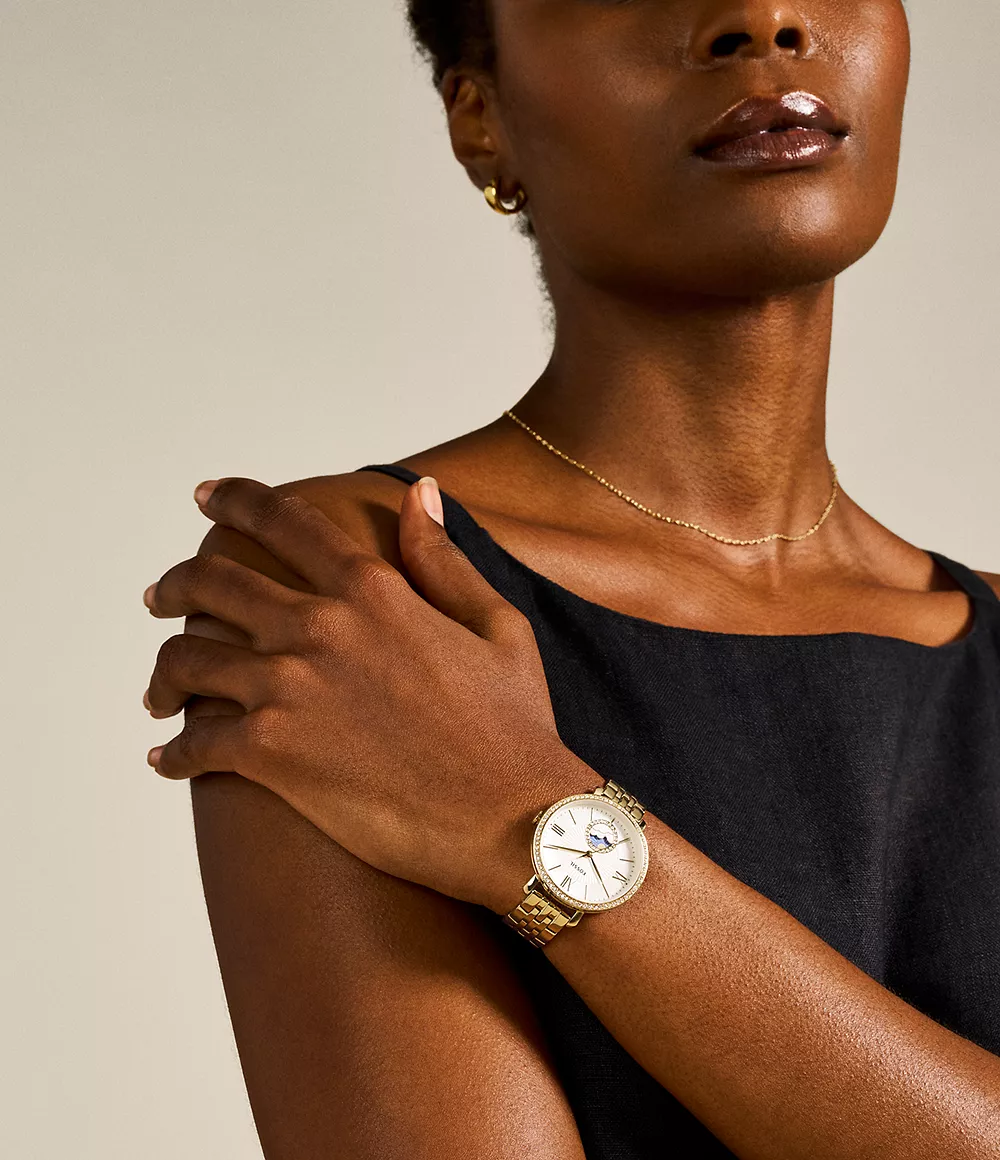 Nebeska elegancija: Jacqueline model sa jedinstvenim prikazom sunca i mjeseca (Day/Night). Zlatno kućište sa kristalima i sedefastim ciferblatom.