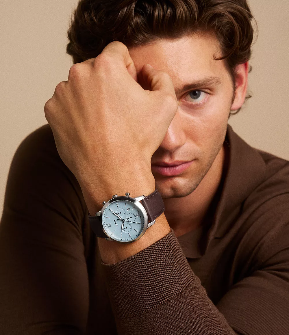Svježa elegancija: Neutra Chronograph sa svijetlo plavim ciferblatom i smeđom kožnom narukvicom. Kućište 44mm, hronograf funkcija.